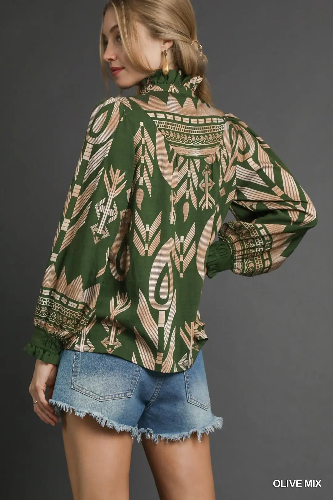 Boho Print Ruffle Neck Blouse